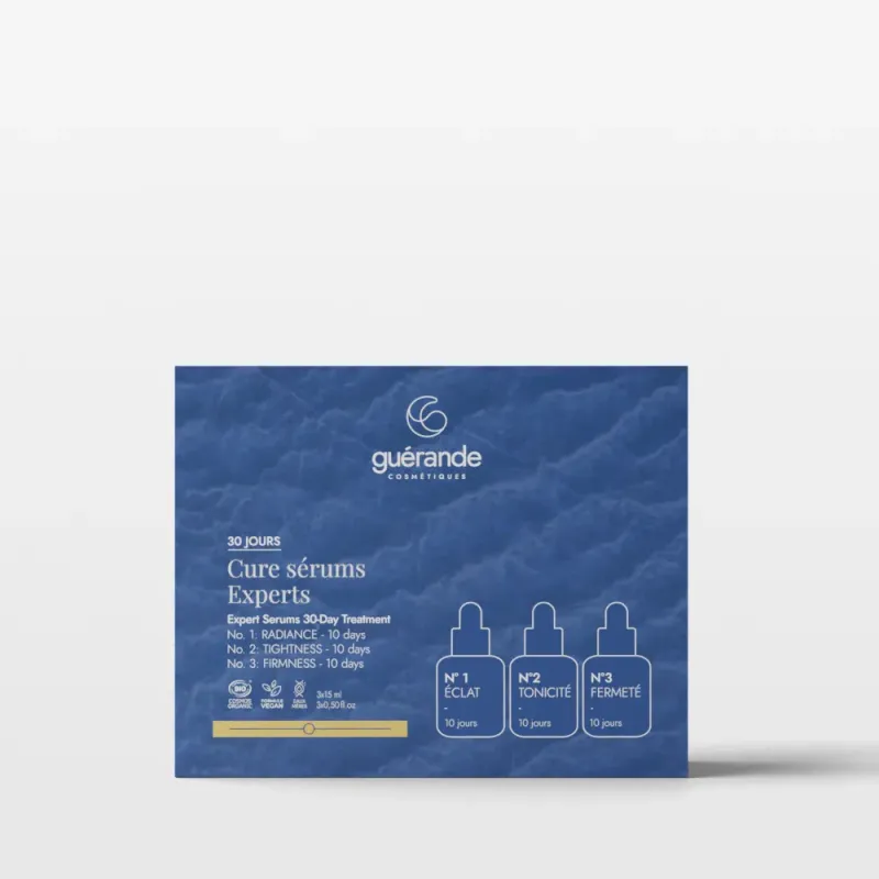 Each organic anti-aging serum in this treatment is formulated with our patented anti-aging complex derived from Guérande Mother-Waters and Sea Fennel. This complex works to stimulate the skin, slowing down the aging process by providing essential nutrients to the cells. The formulation of the Expert Serums 30-Day Treatment also includes Retinol-like, a natural active ingredient that stimulates type 1 collagen synthesis, along with a synergy of specifically selected active ingredients known for their anti-aging properties on the skin.