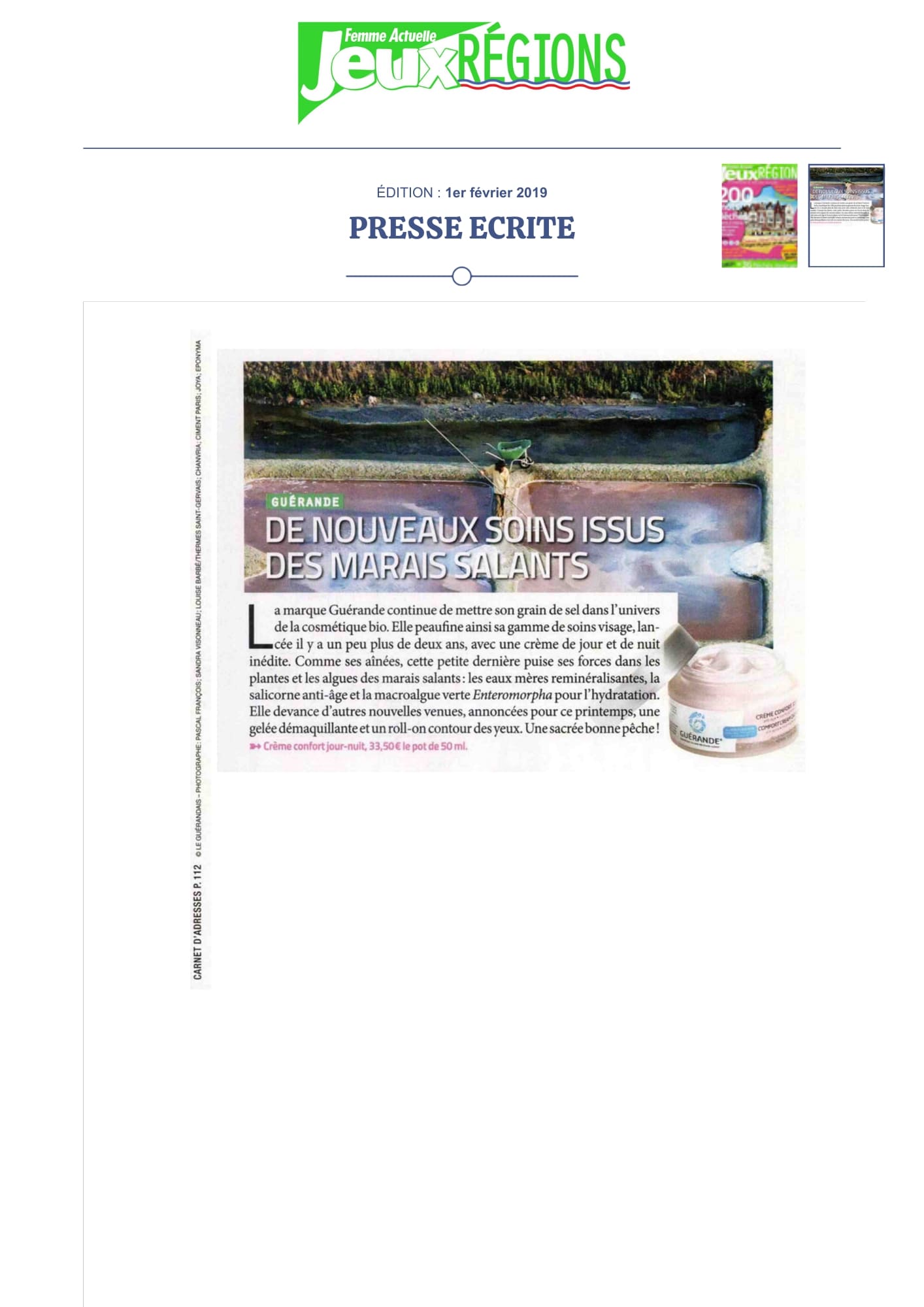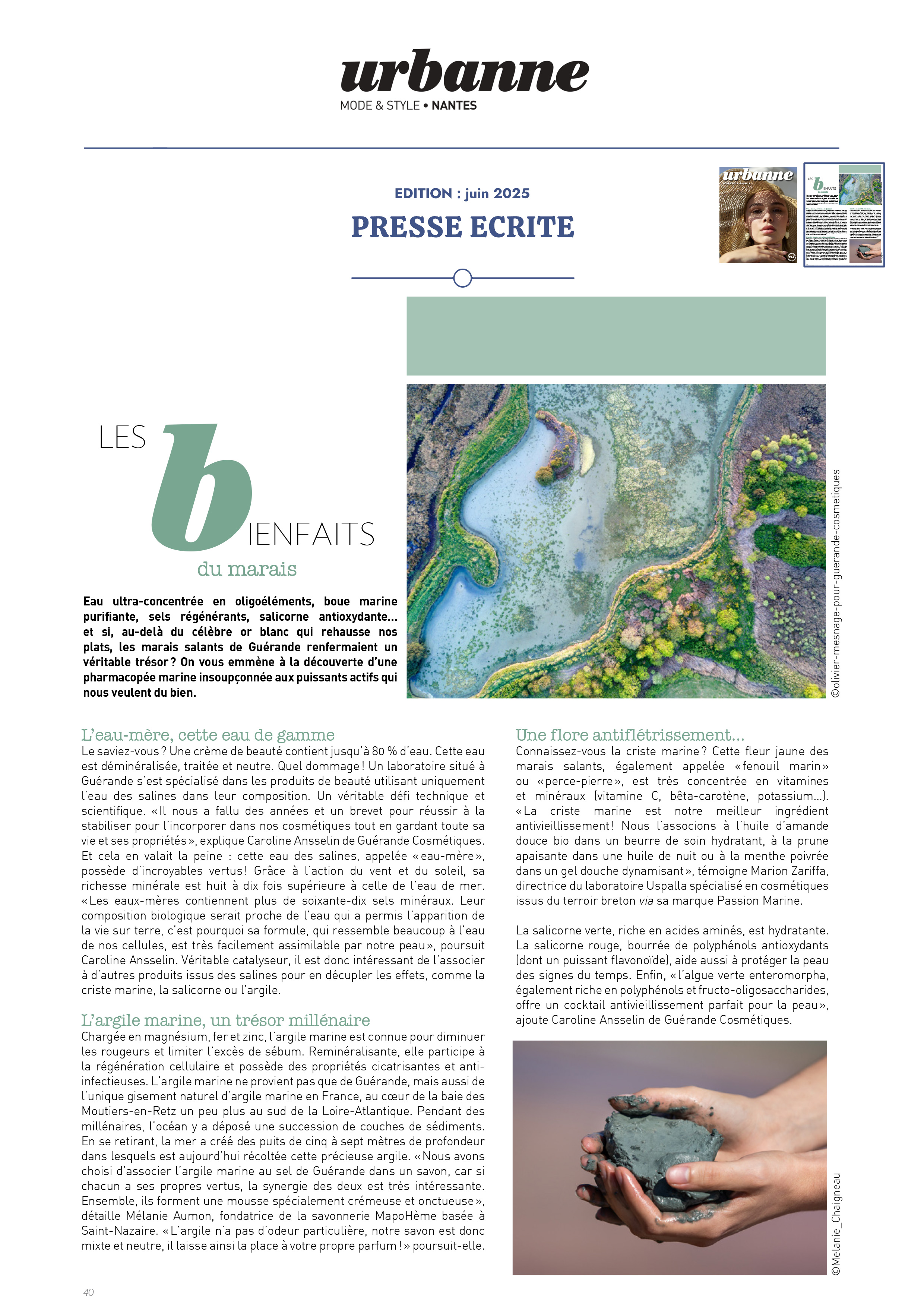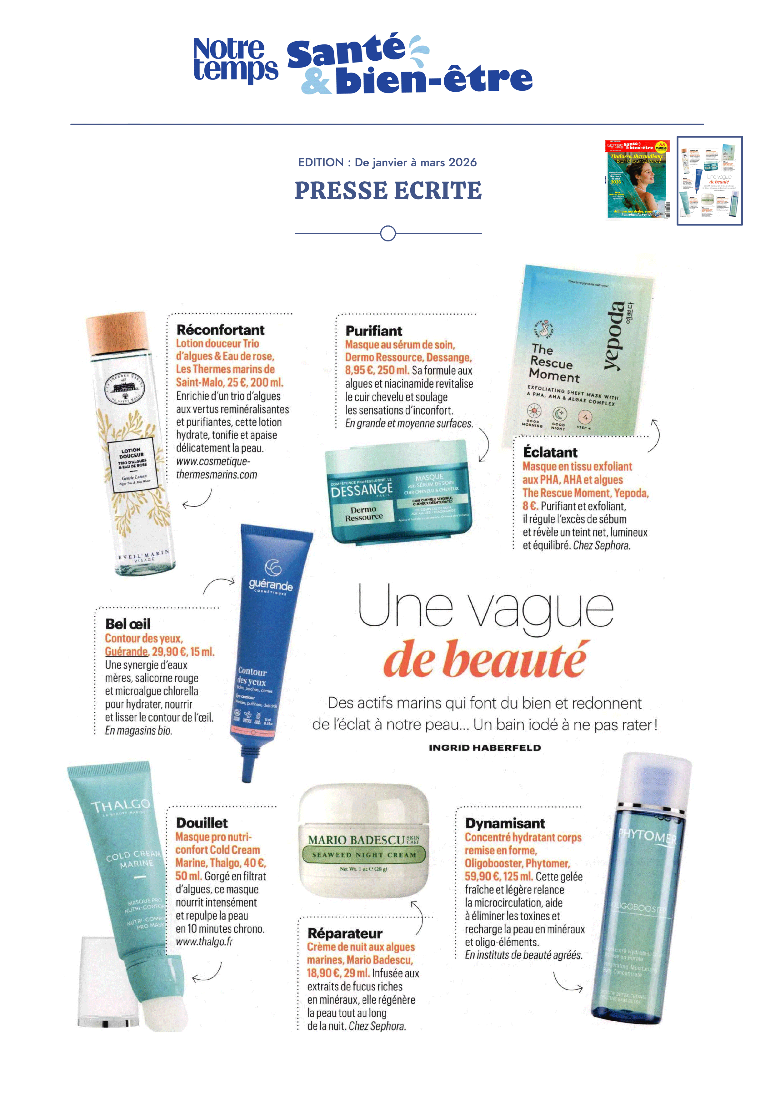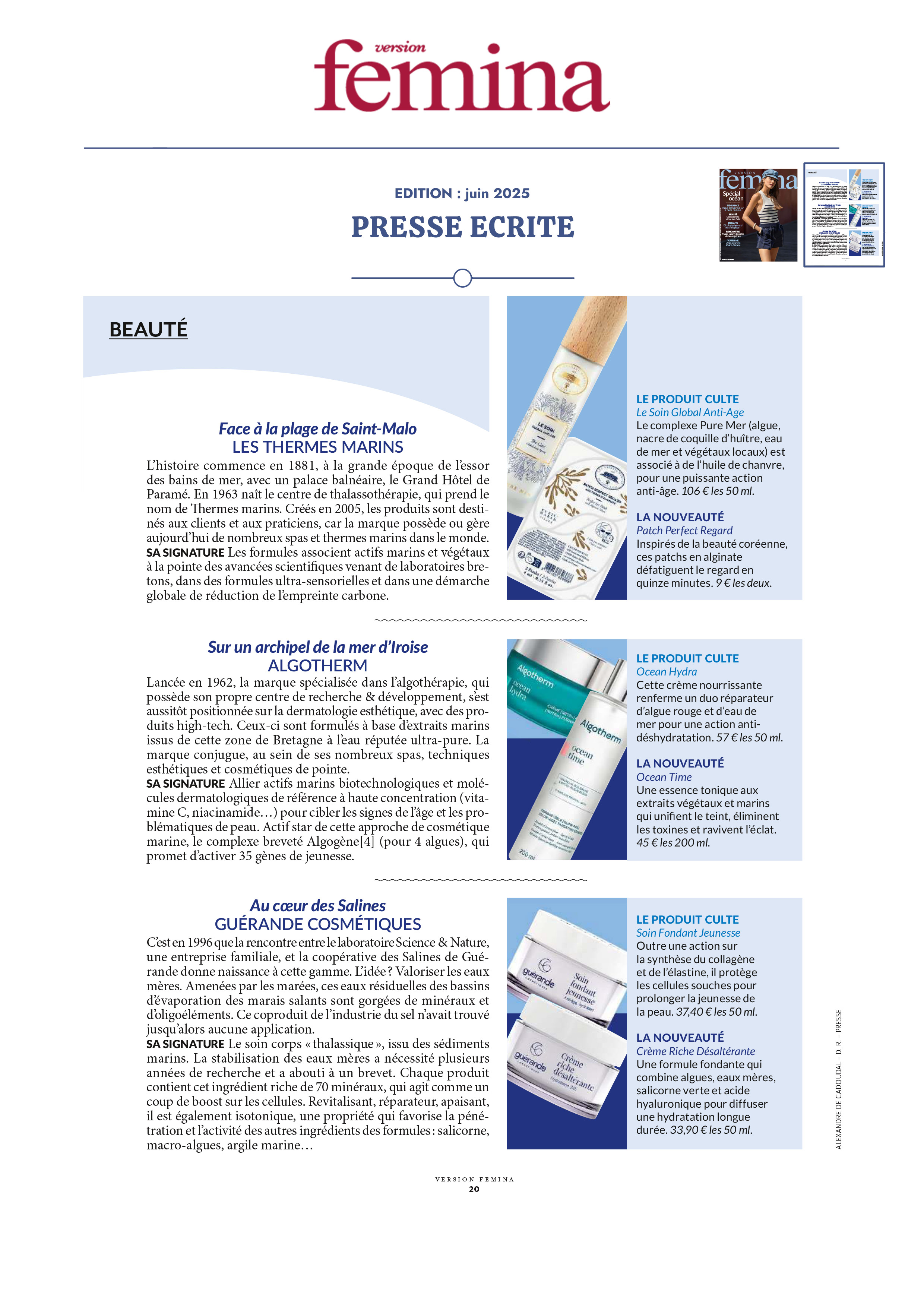 Notre univers, inspiré par les salines de Guérande et nourri par la science et le soin thalassiques, suscite curiosité et enthousiasme. Presse, radio, TV... retrouvez-ici une sélection de notre revue de presse. Chaque parution témoigne de l’intérêt croissant pour notre approche engagée, respectueuse de la peau et de l’environnement. À travers ces articles, c’est toute l’âme de notre marque qui se révèle, entre naturalité, innovation et authenticité.