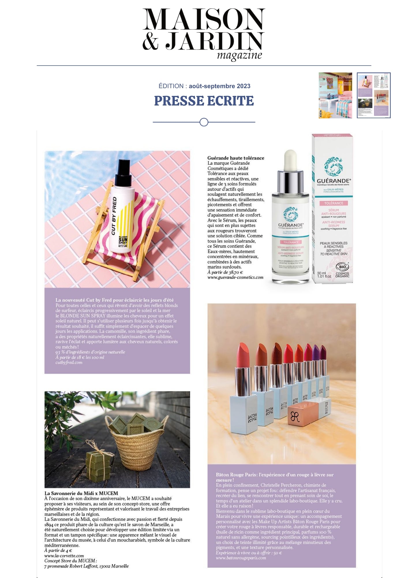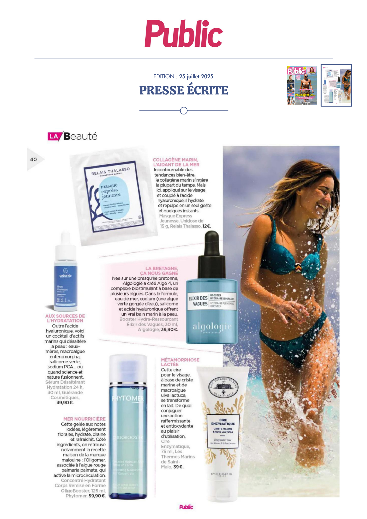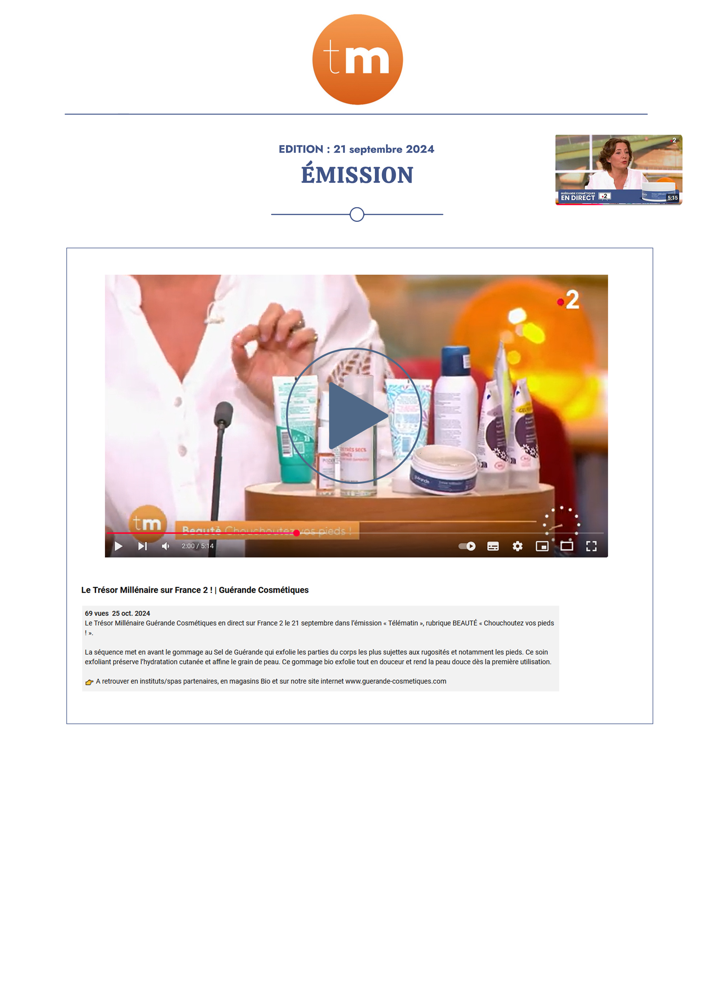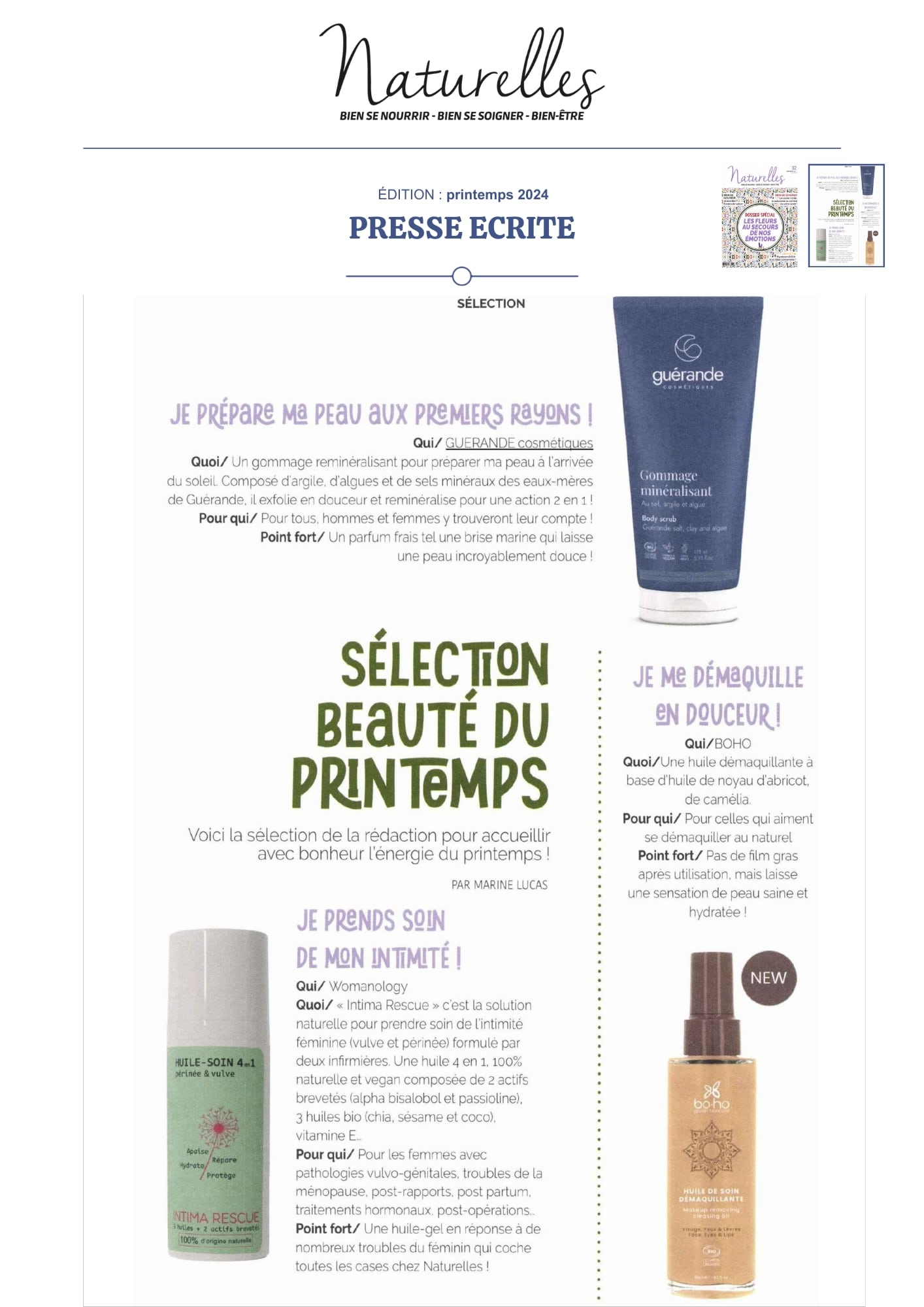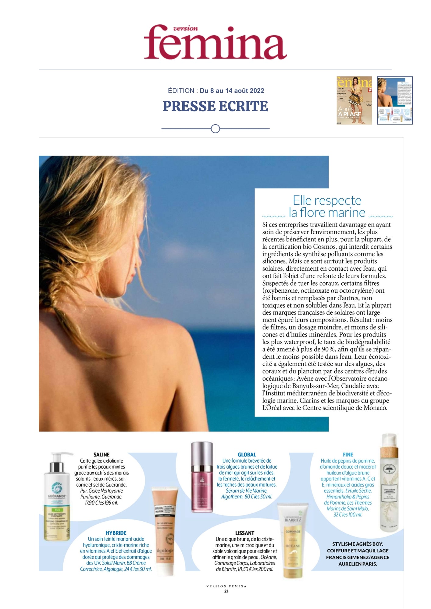 Notre univers, inspiré par les salines de Guérande et nourri par la science et le soin thalassiques, suscite curiosité et enthousiasme. Presse, radio, TV... retrouvez-ici une sélection de notre revue de presse. Chaque parution témoigne de l’intérêt croissant pour notre approche engagée, respectueuse de la peau et de l’environnement. À travers ces articles, c’est toute l’âme de notre marque qui se révèle, entre naturalité, innovation et authenticité.