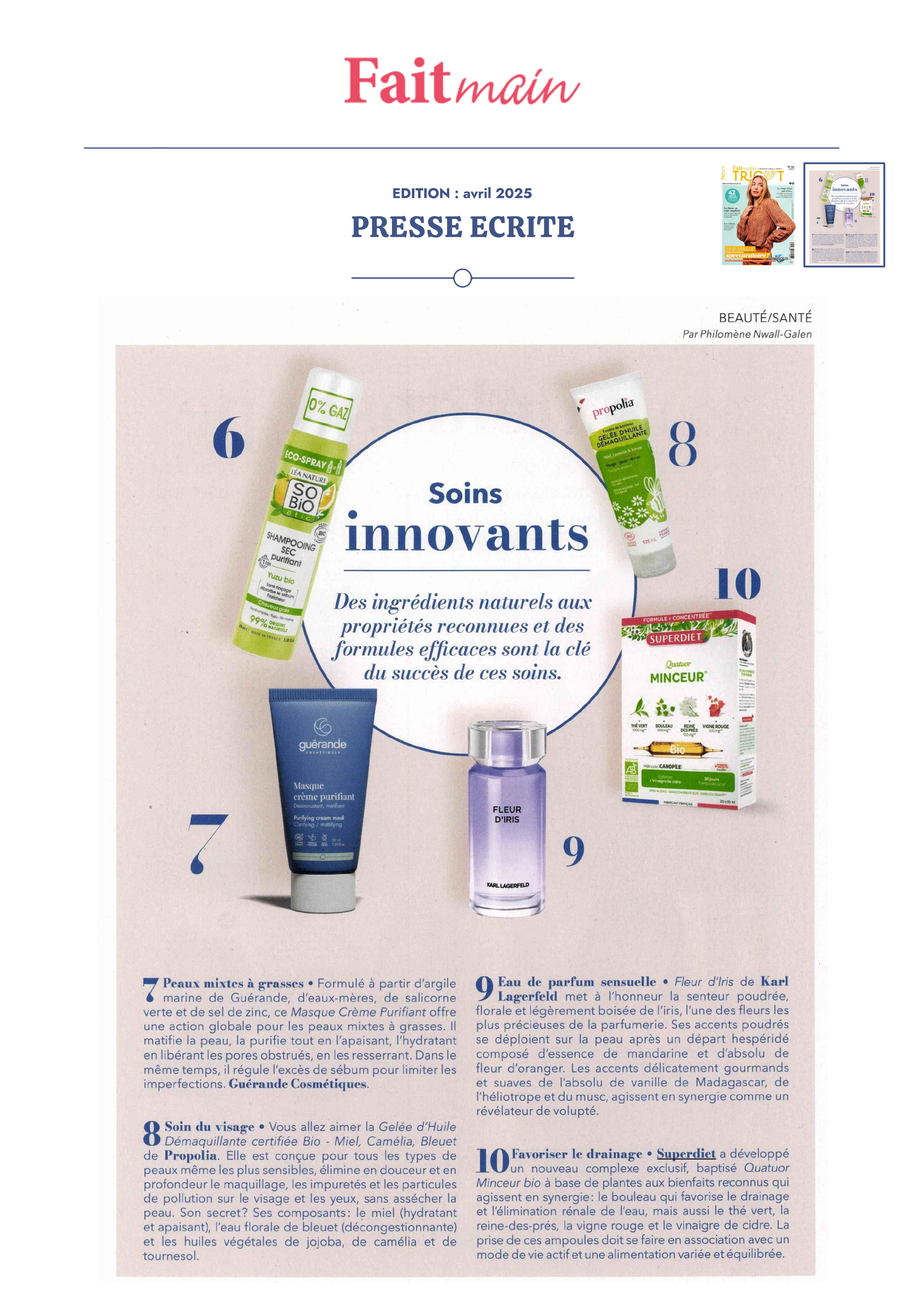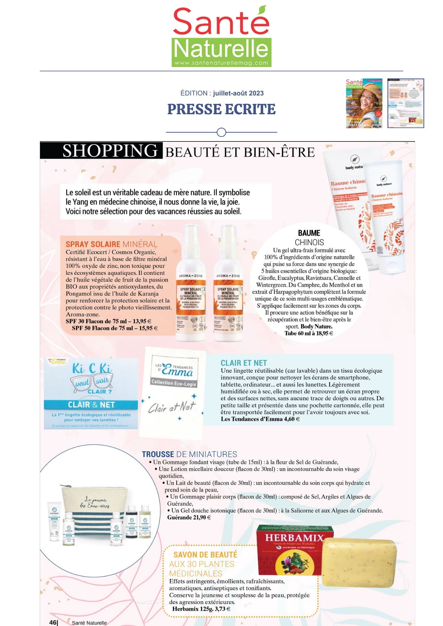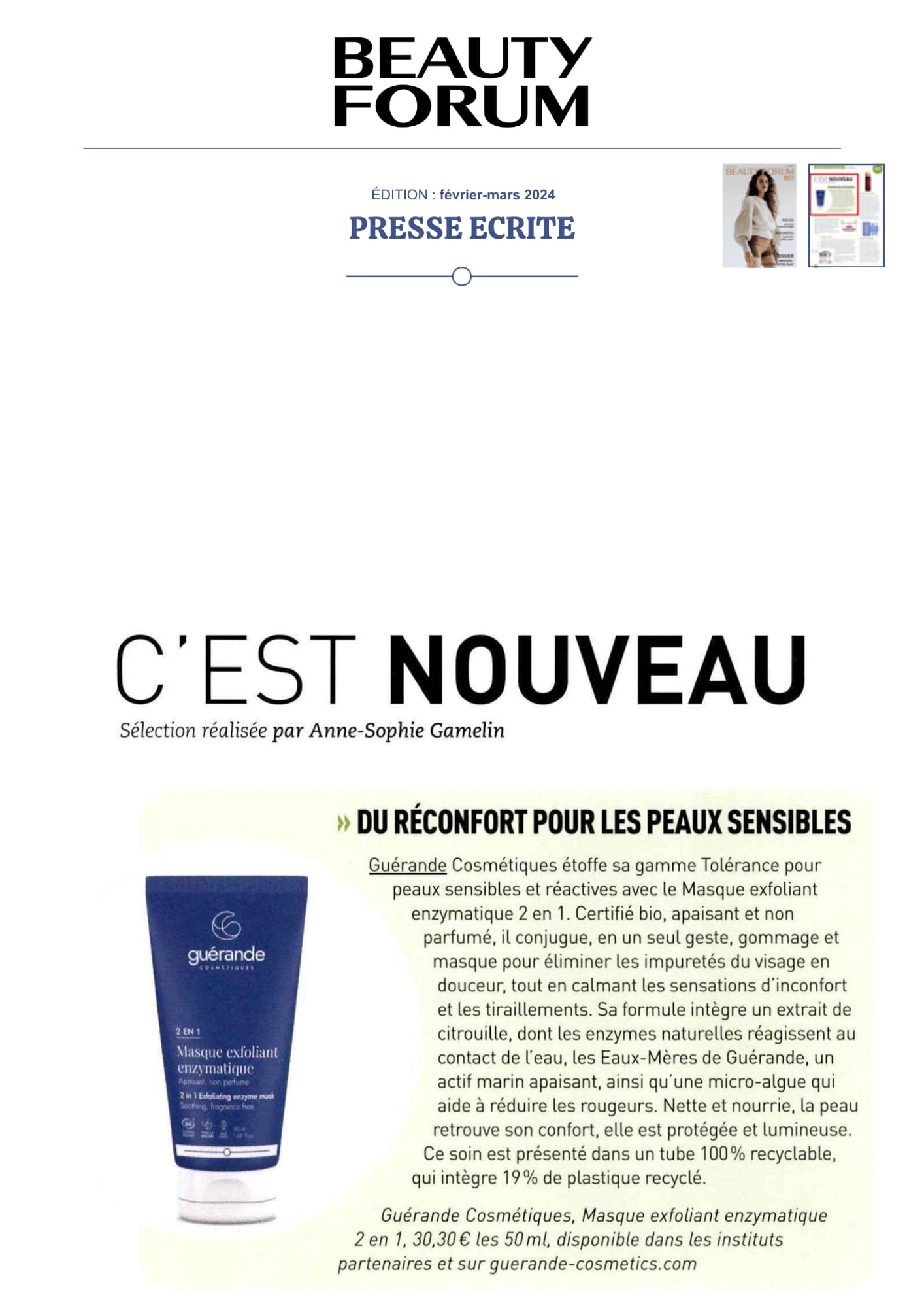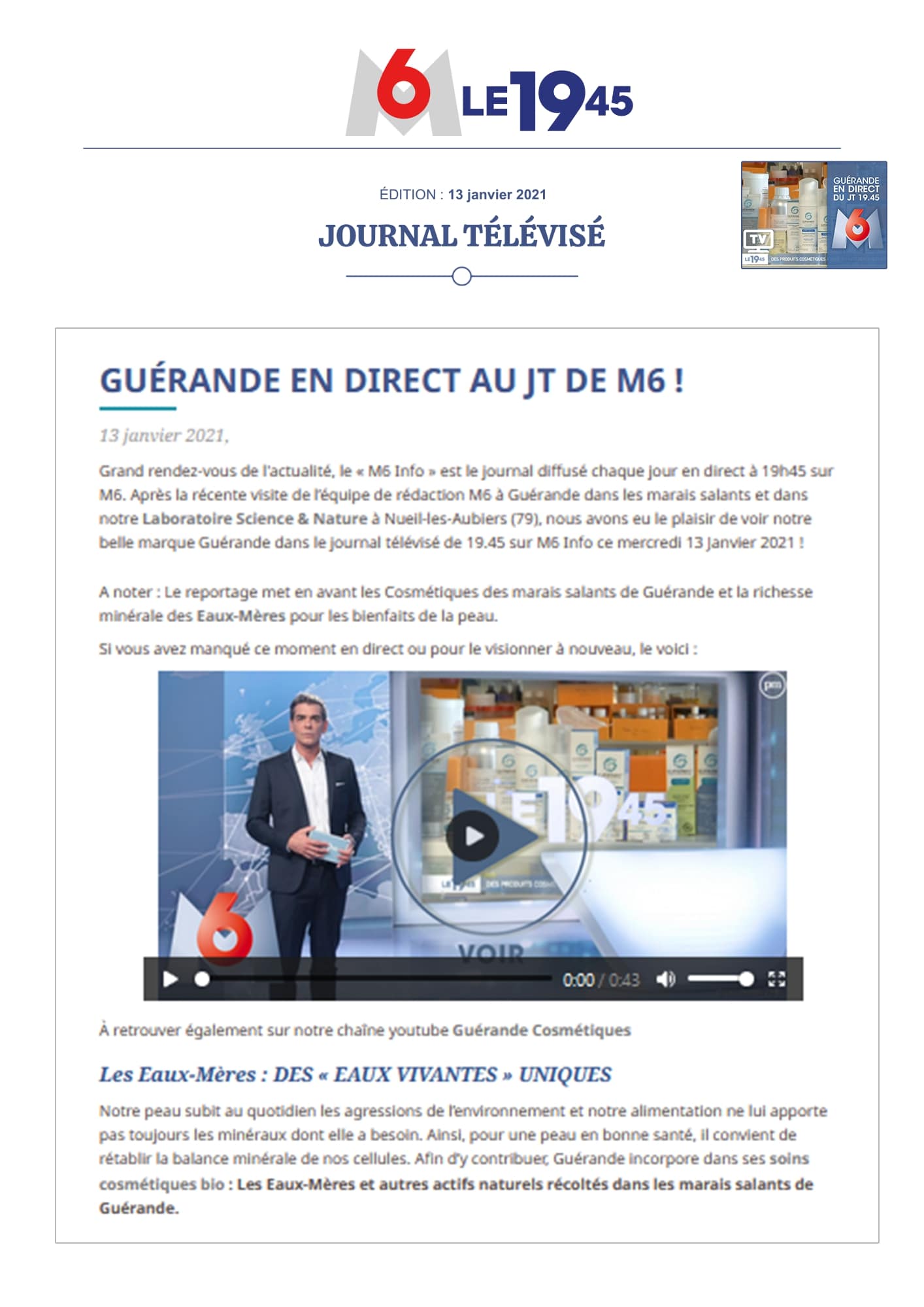 Notre univers, inspiré par les salines de Guérande et nourri par la science et le soin thalassiques, suscite curiosité et enthousiasme. Presse, radio, TV... retrouvez-ici une sélection de notre revue de presse. Chaque parution témoigne de l’intérêt croissant pour notre approche engagée, respectueuse de la peau et de l’environnement. À travers ces articles, c’est toute l’âme de notre marque qui se révèle, entre naturalité, innovation et authenticité.