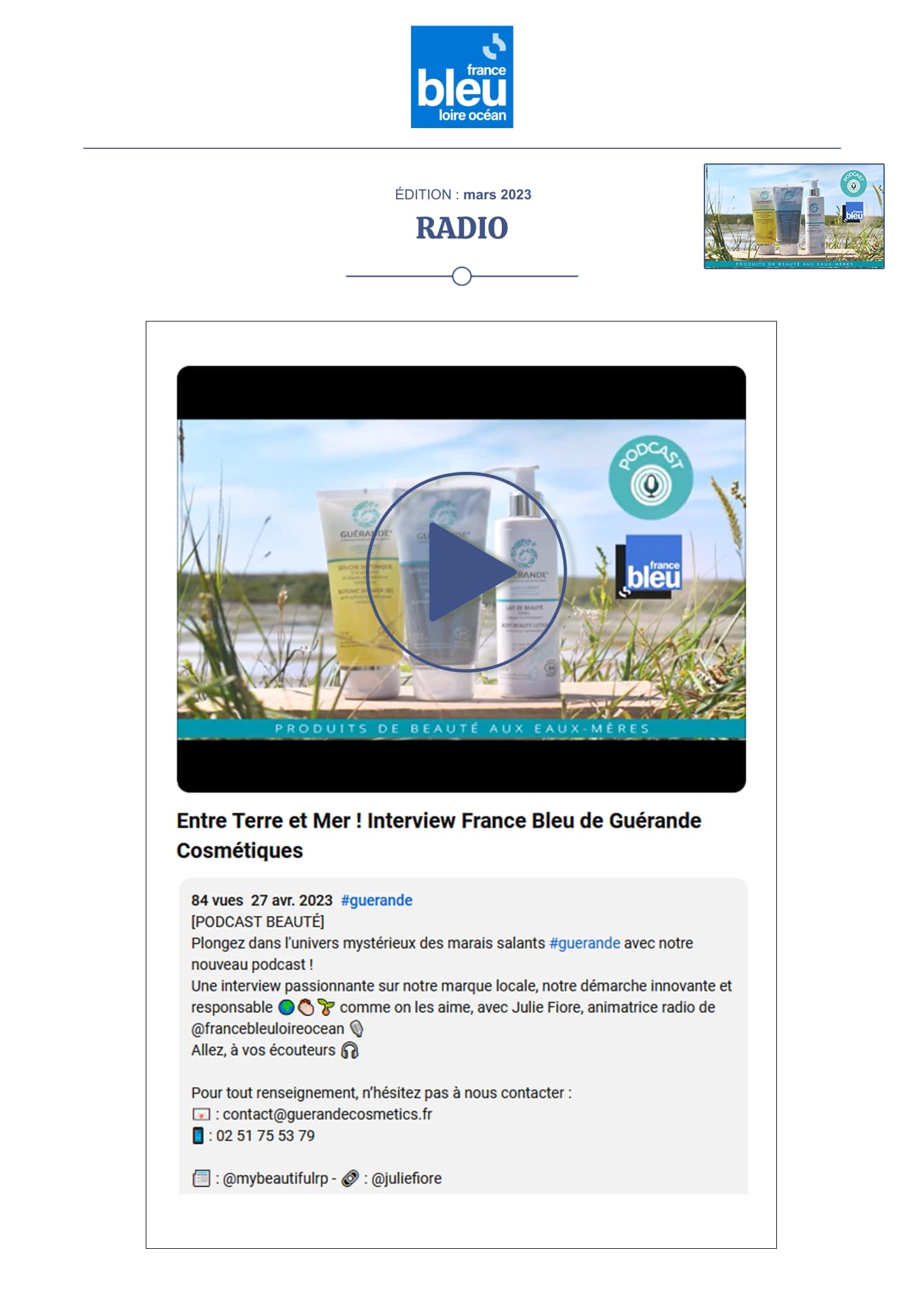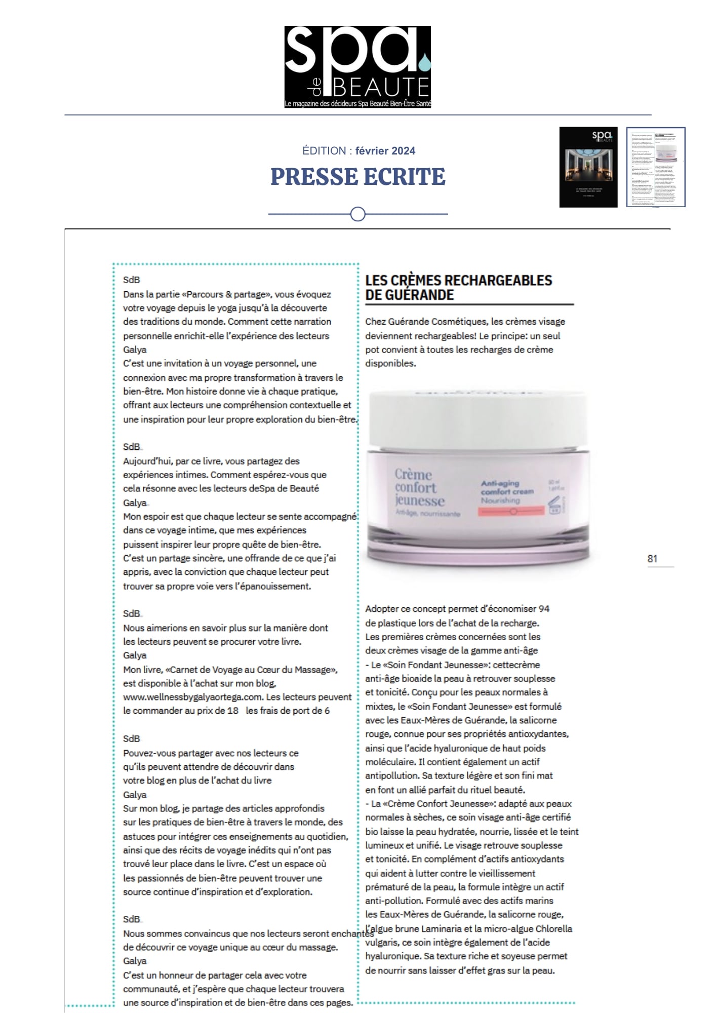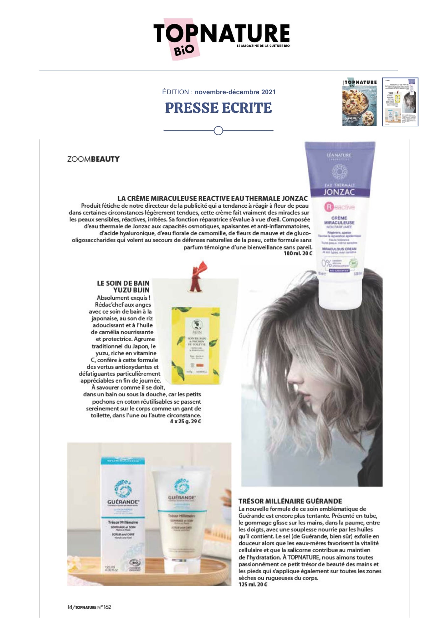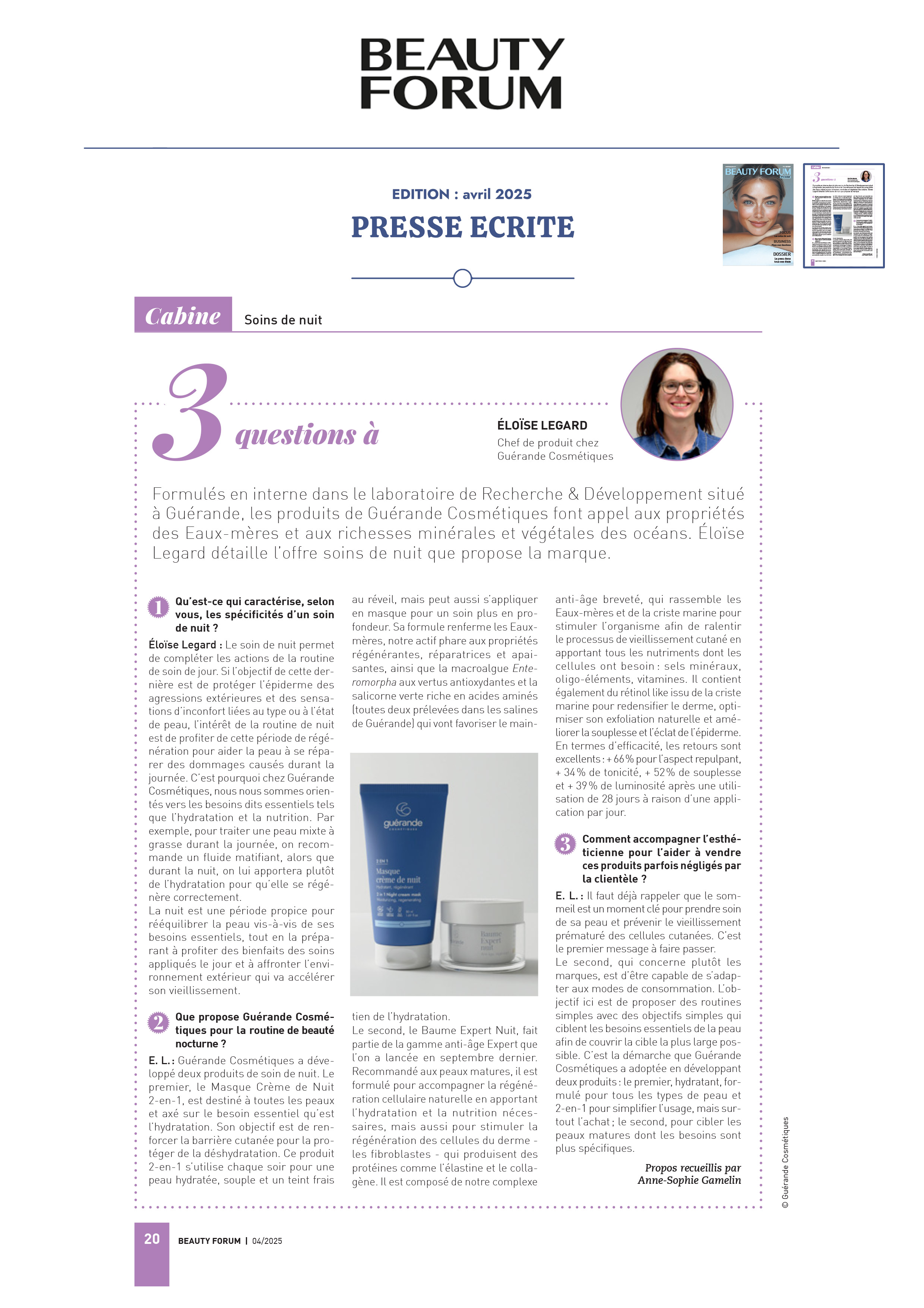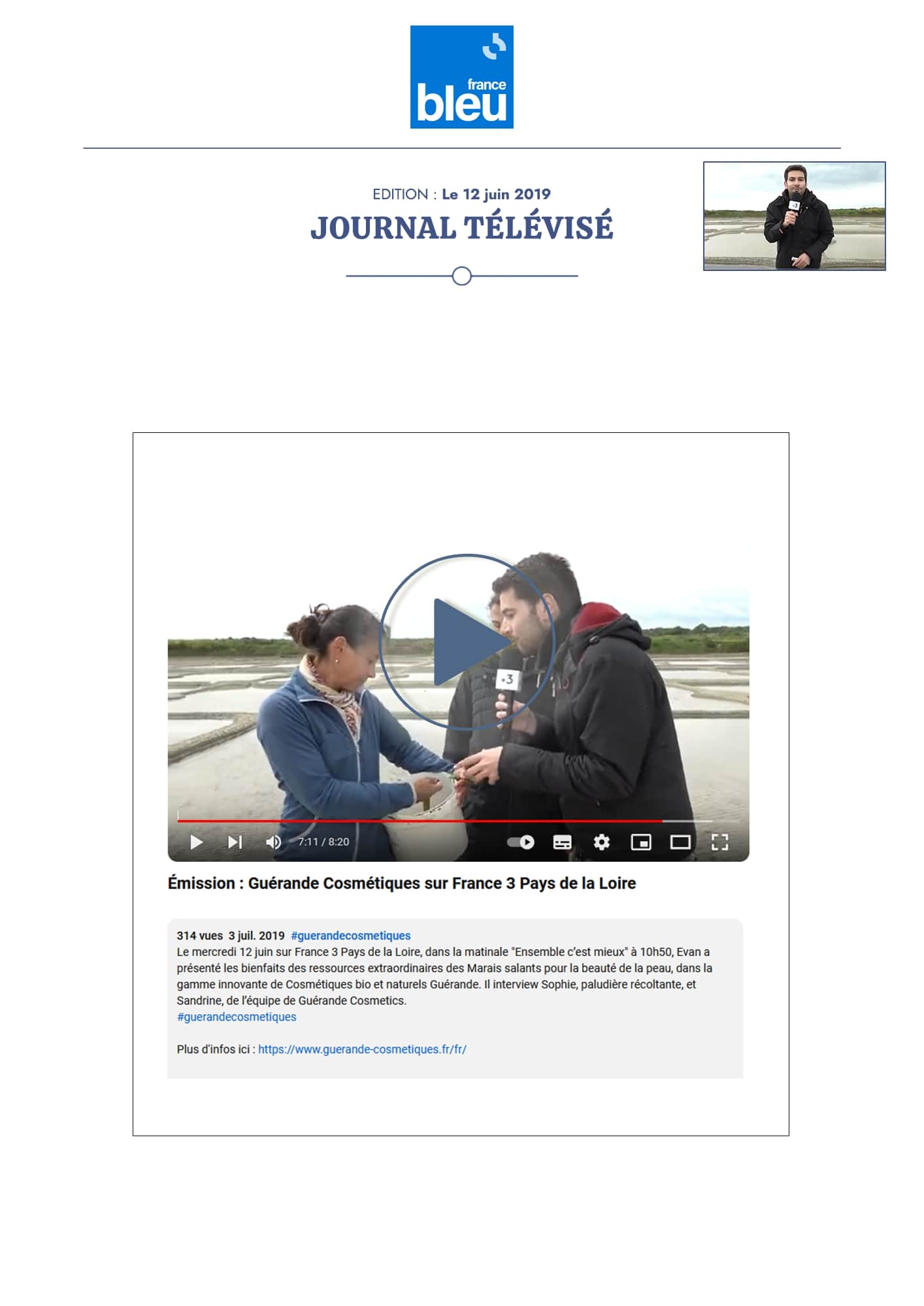 Notre univers, inspiré par les salines de Guérande et nourri par la science et le soin thalassiques, suscite curiosité et enthousiasme. Presse, radio, TV... retrouvez-ici une sélection de notre revue de presse. Chaque parution témoigne de l’intérêt croissant pour notre approche engagée, respectueuse de la peau et de l’environnement. À travers ces articles, c’est toute l’âme de notre marque qui se révèle, entre naturalité, innovation et authenticité.