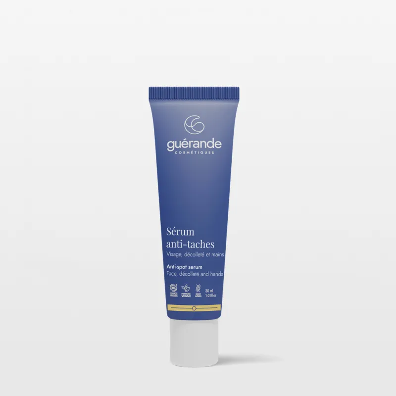 Formulé par nos soins, le Sérum anti-taches incorpore un complexe breveté anti-âge issu des Eaux-mères de Guérande et de Criste marine, qui booste de +80% et +170% les gènes impliqués dans la limitation de la pigmentation en inhibant la mélanogenèse et la migration de mélanine. Ce produit de beauté est également formulé avec des actifs naturels rigoureusement sélectionnés pour leur efficacité : Rétinol-like, Algues et Vitamine C.